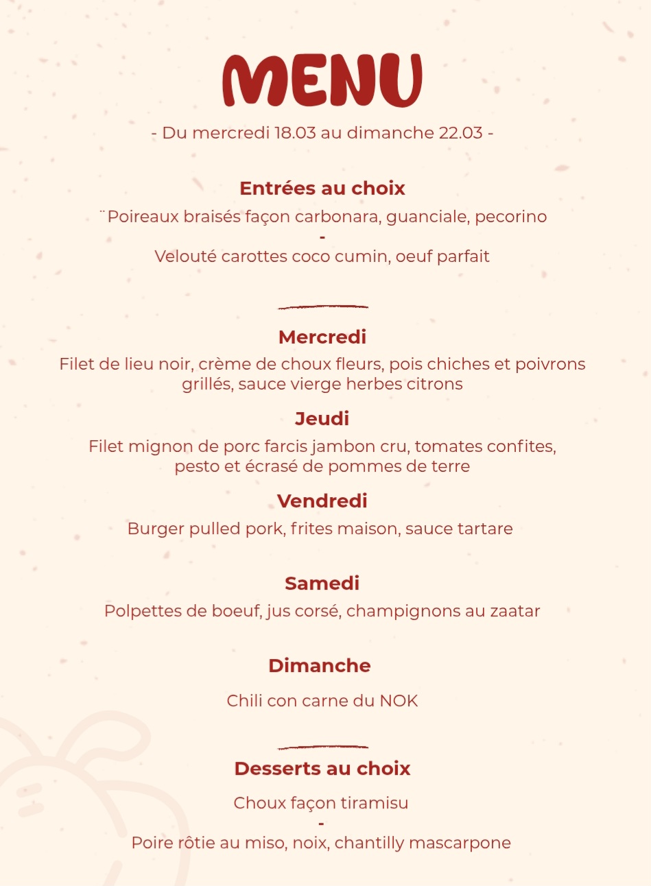Nous proposons un menu unique de 12h à 14h, avec 2 entrées et 2 desserts à la semaine et un plat unique qui change chaque jour.